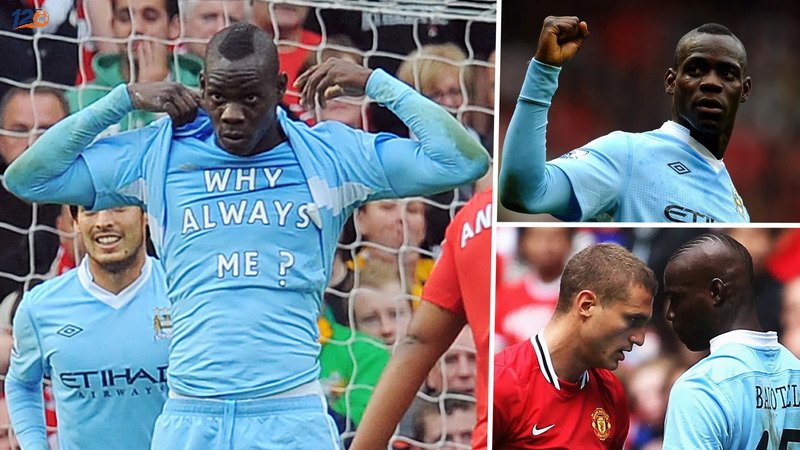 Khi đó, Manchester City đánh bại Manchester United với tỉ số 6 – 1 ngay tại sân Old Trafford, trong khuôn khổ vòng 9 Premier League 2011/12. Balotelli đã mở tỷ số ở phút thứ 22, sau đó hoàn tất cú đúp ở phút thứ 60. Tuy nhiên thay vì ăn mừng theo cách thông thường, anh bình tĩnh vén áo, để lộ dòng chữ “Why always me?” in trên áo giữ nhiệt bên trong.